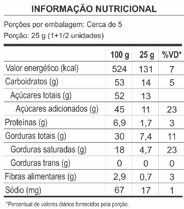 ALÉRGICOS: CONTÉM CASTANHA DE CAJU, AMENDOIM, AMÊNDOA E DERIVADOS DE SOJA E LEITE. PODE CONTER AVELÃ, CASTANHAS, PECÃS, PISTACHE E TRIGO. CONTÉM GLÚTEN. CONTÉM LACTOSE. COLORIDO ARTIFICIALMENTE.