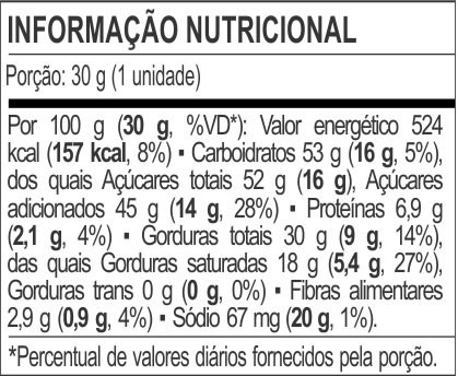 ALÉRGICOS: CONTÉM DERIVADOS DE SOJA E LEITE. PODE CONTER AMÊNDOA, AMENDOIM, AVELÃ, CASTANHA DE CAJU, CASTANHAS, NOZES, PECÃS, PISTACHE E TRIGO. CONTÉM GLÚTEN. CONTÉM LACTOSE.