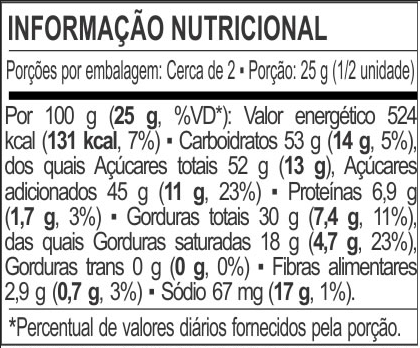 ALÉRGICOS: CONTÉM DERIVADOS DE SOJA E LEITE. PODE CONTER AMÊNDOA, AMENDOIM, AVELÃ, CASTANHA DE CAJU, CASTANHAS, NOZES, PECÃS, PISTACHE E TRIGO. CONTÉM GLÚTEN. CONTÉM LACTOSE.
