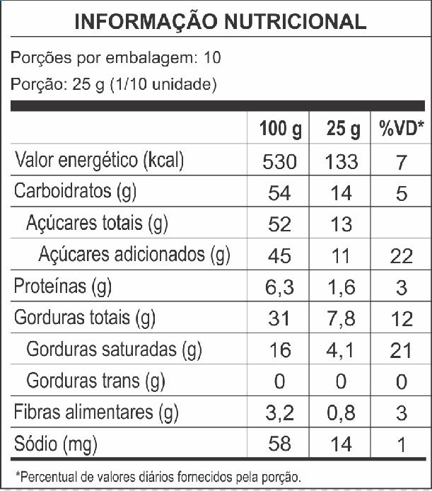 ALÉRGICOS: CONTÉM AVELÃ, DERIVADOS DE SOJA E LEITE. PODE CONTER AMÊNDOA, AMENDOIM, CASTANHA DE CAJU, CASTANHAS, NOZES, PECÃS, TRIGO E PISTACHE. CONTÉM LACTOSE. CONTÉM GLÚTEN.